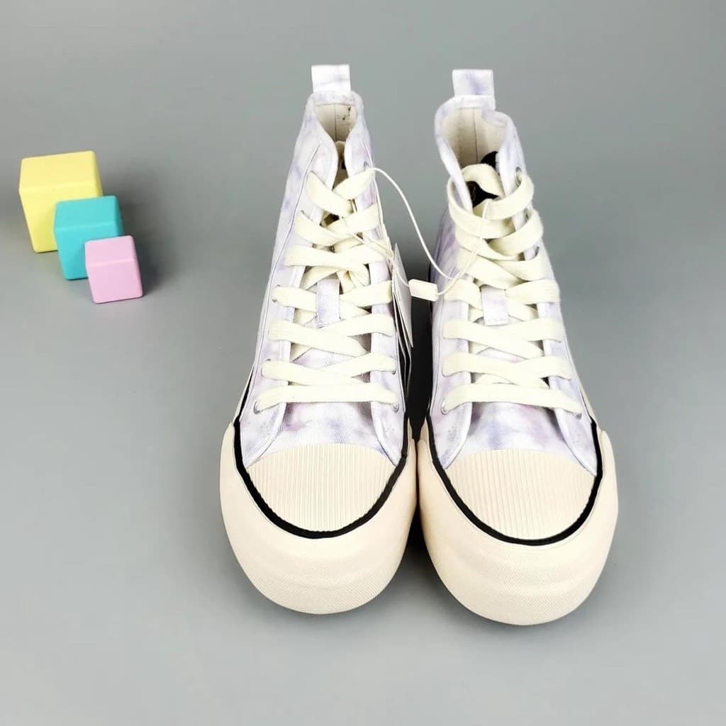 Дизайн: Високі кеди з принтом тай-дай у світлих тонах (фіолетовий/бузковий та білий).