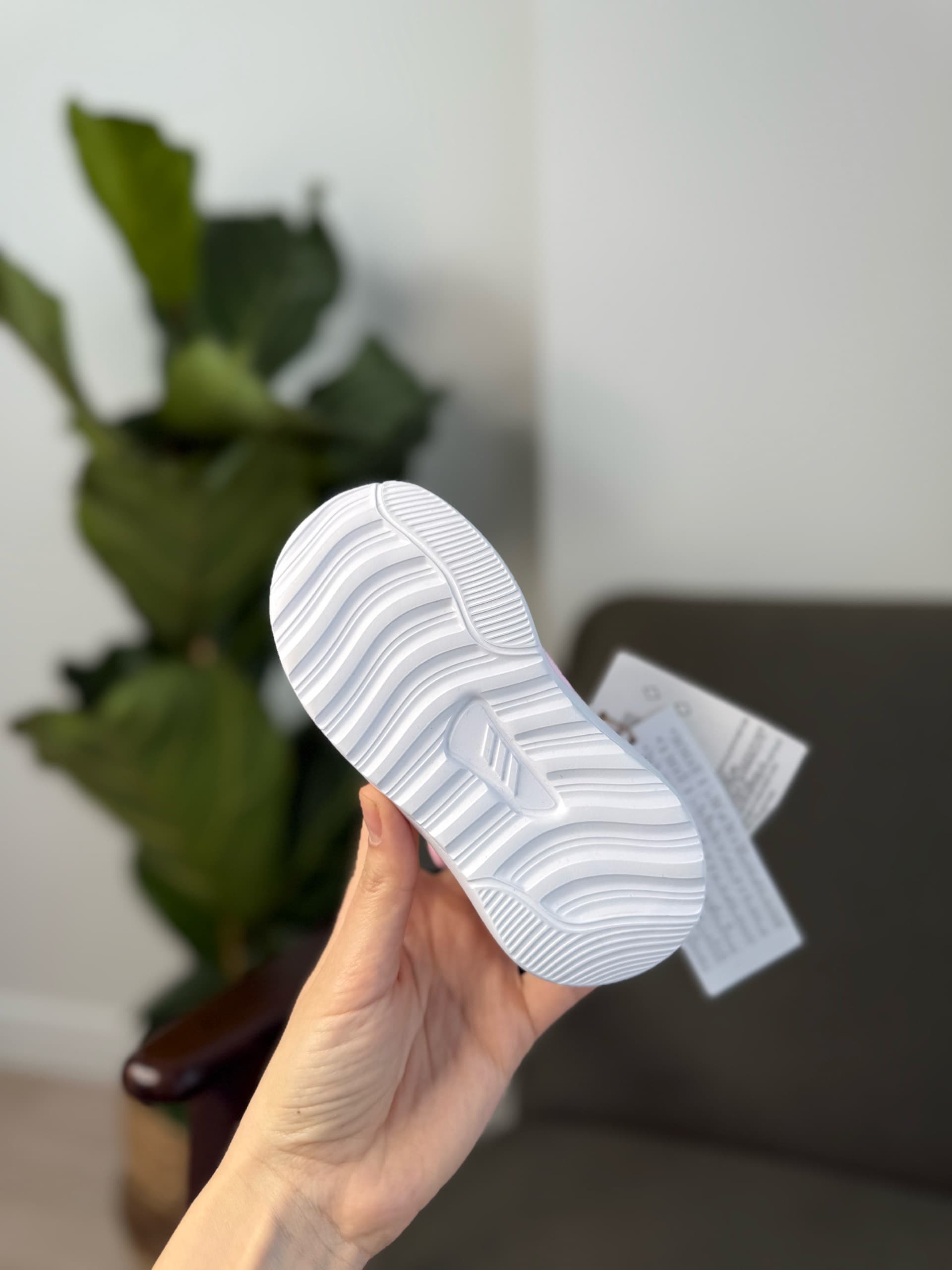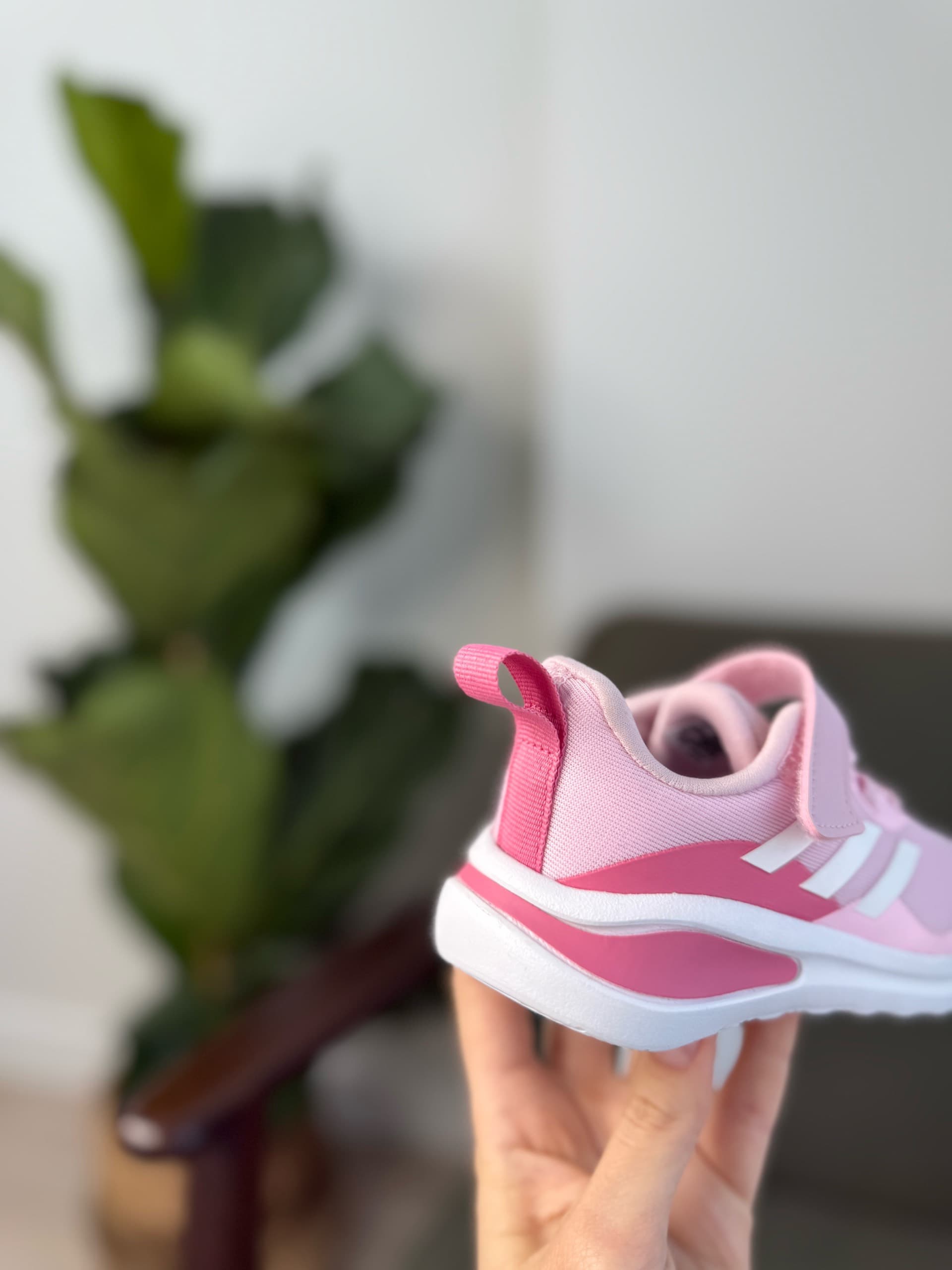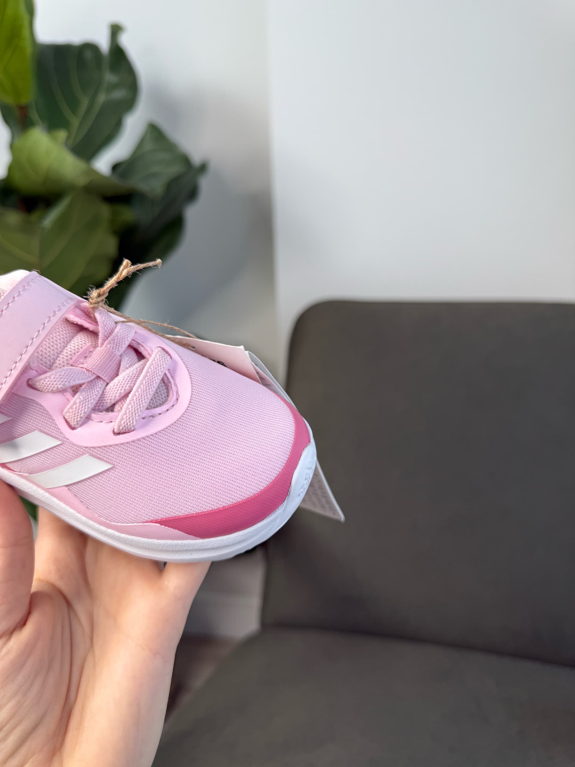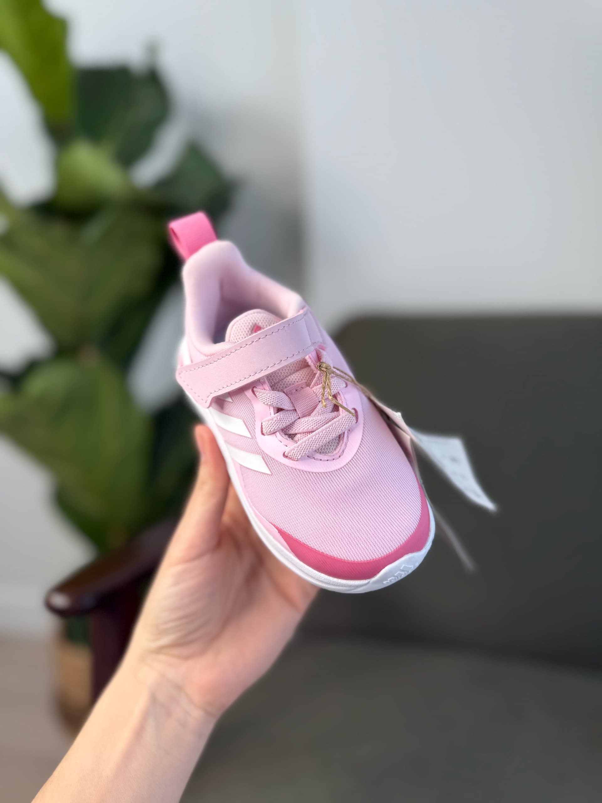 Рожеві дитячі кросівки з текстильним верхом, білими смужками Adidas збоку, білою проміжною підошвою та застібкою-липучкою поверх шнурків. Вони призначені для комфорту та підтримки під час активних ігор.