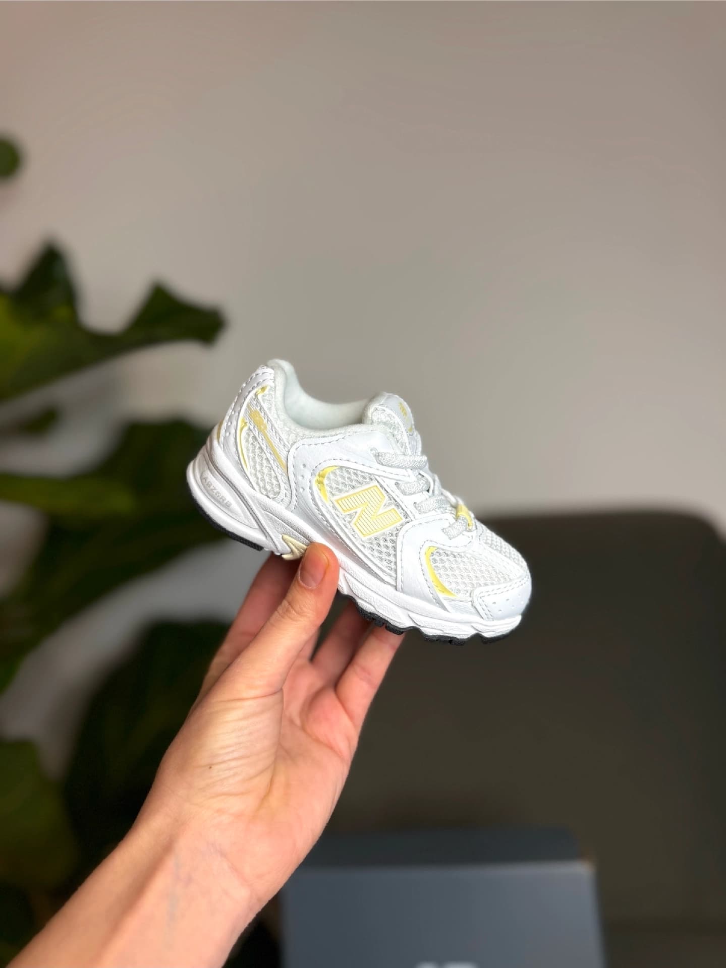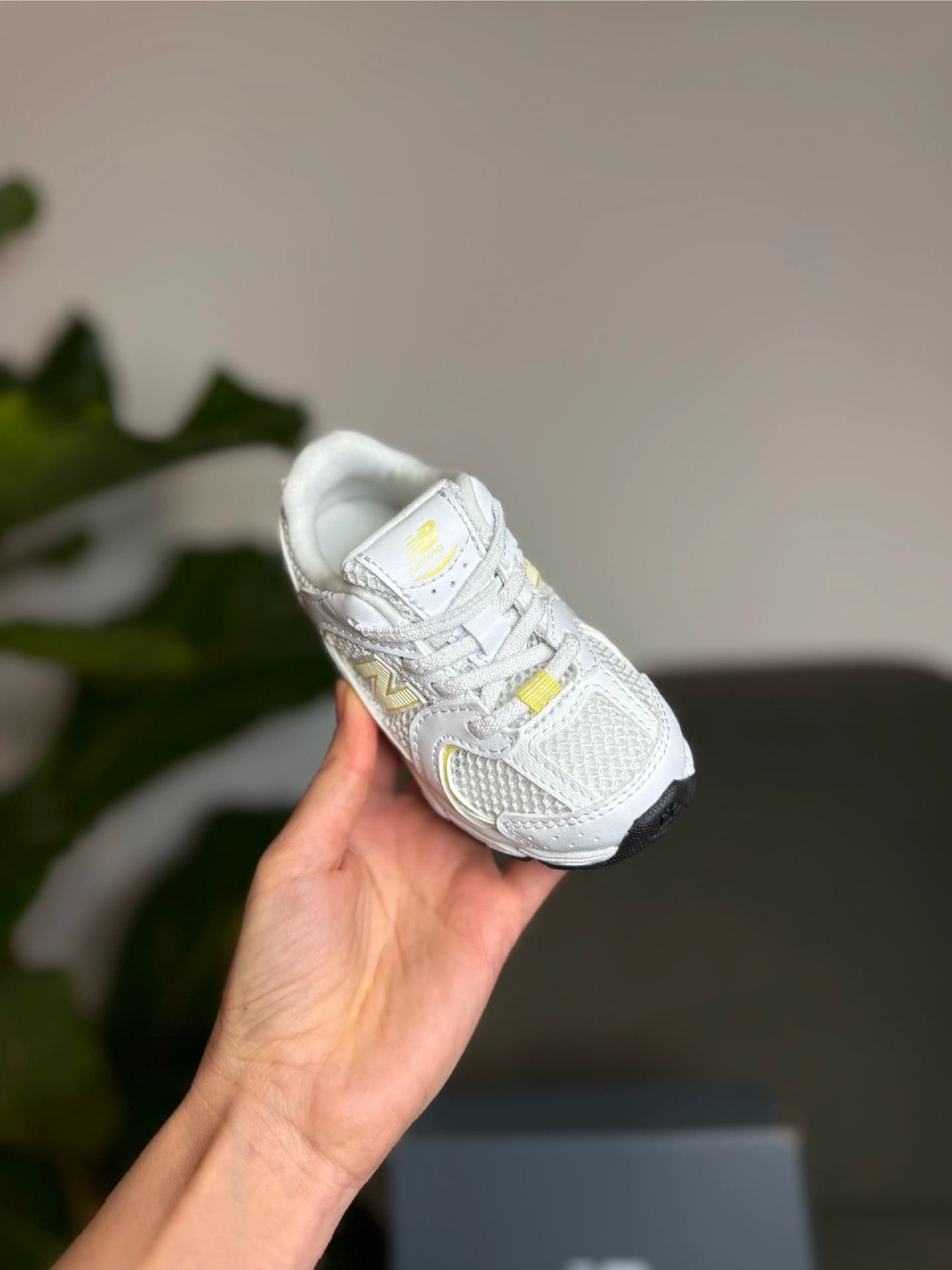 Дизайн: Взуття має сітчастий верх для повітропроникності з синтетичними накладками білого кольору та яскравими жовтими акцентами, включаючи логотип "N" збоку.