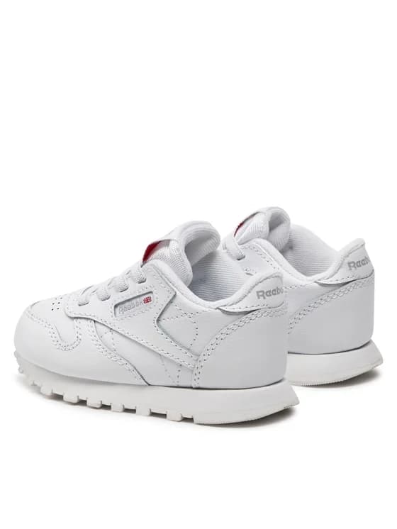 Це класична модель спортивного взуття Reebok білого кольору, виготовлена зі шкіри, з традиційним дизайном і шнурівкою.