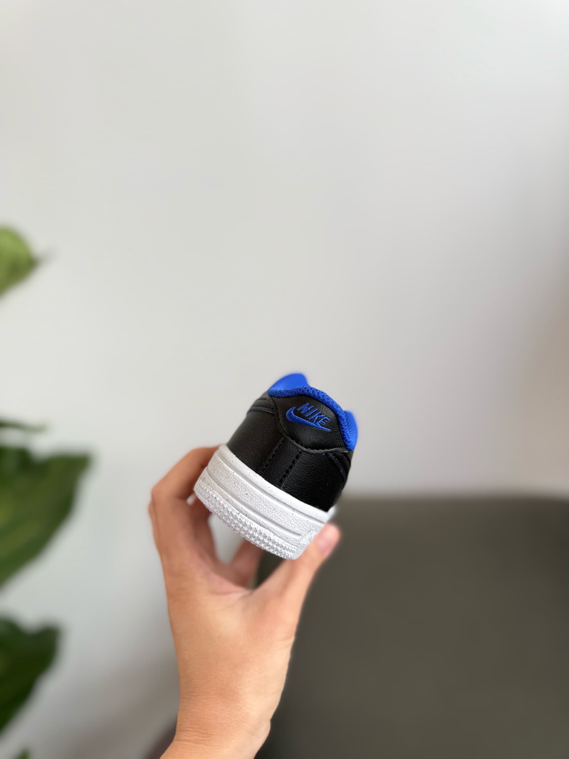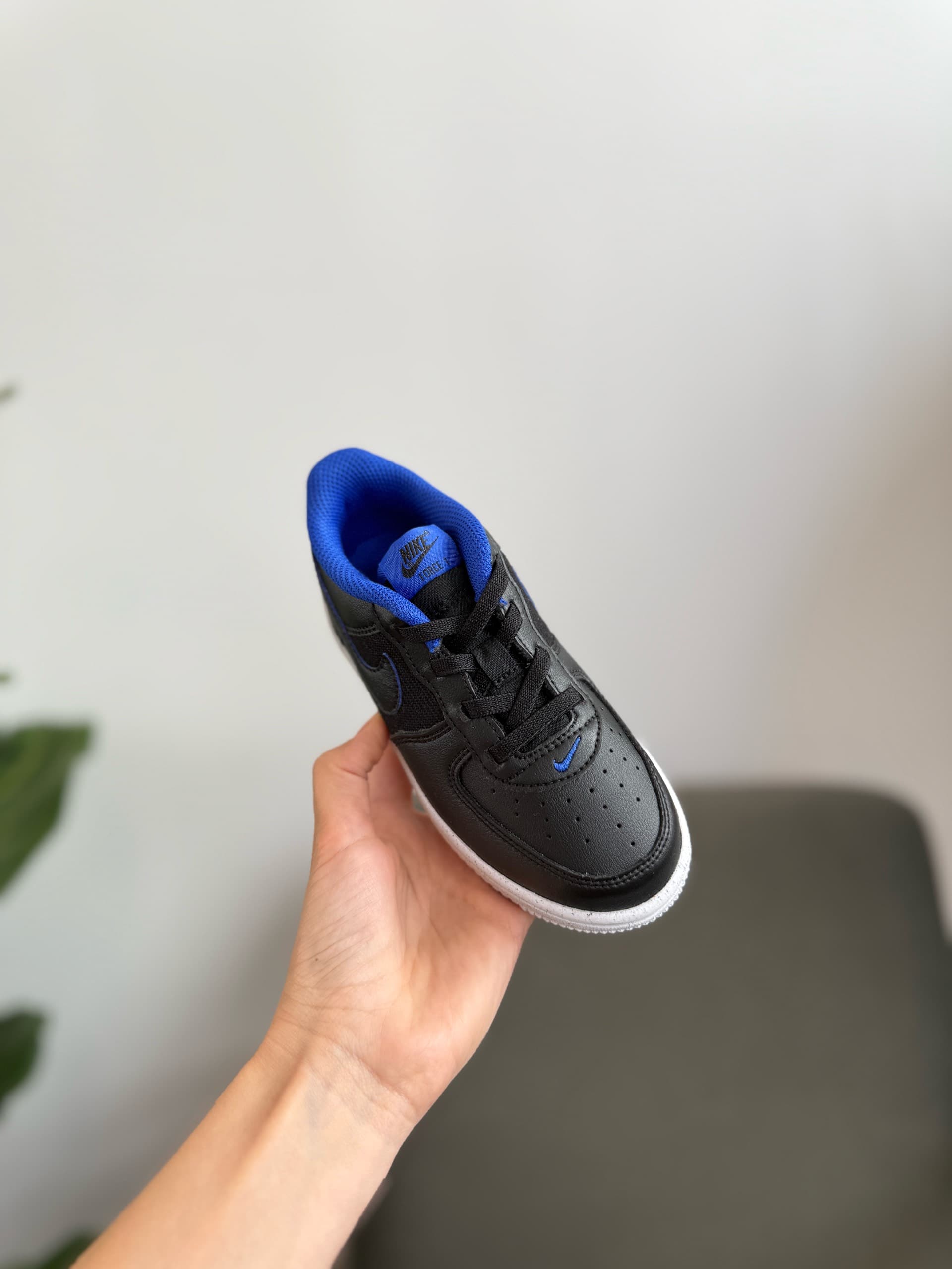Кольори: Кросівки мають переважно чорний верх із білою підошвою. Внутрішня підкладка та деталі язичка виконані в яскраво-синьому кольорі.