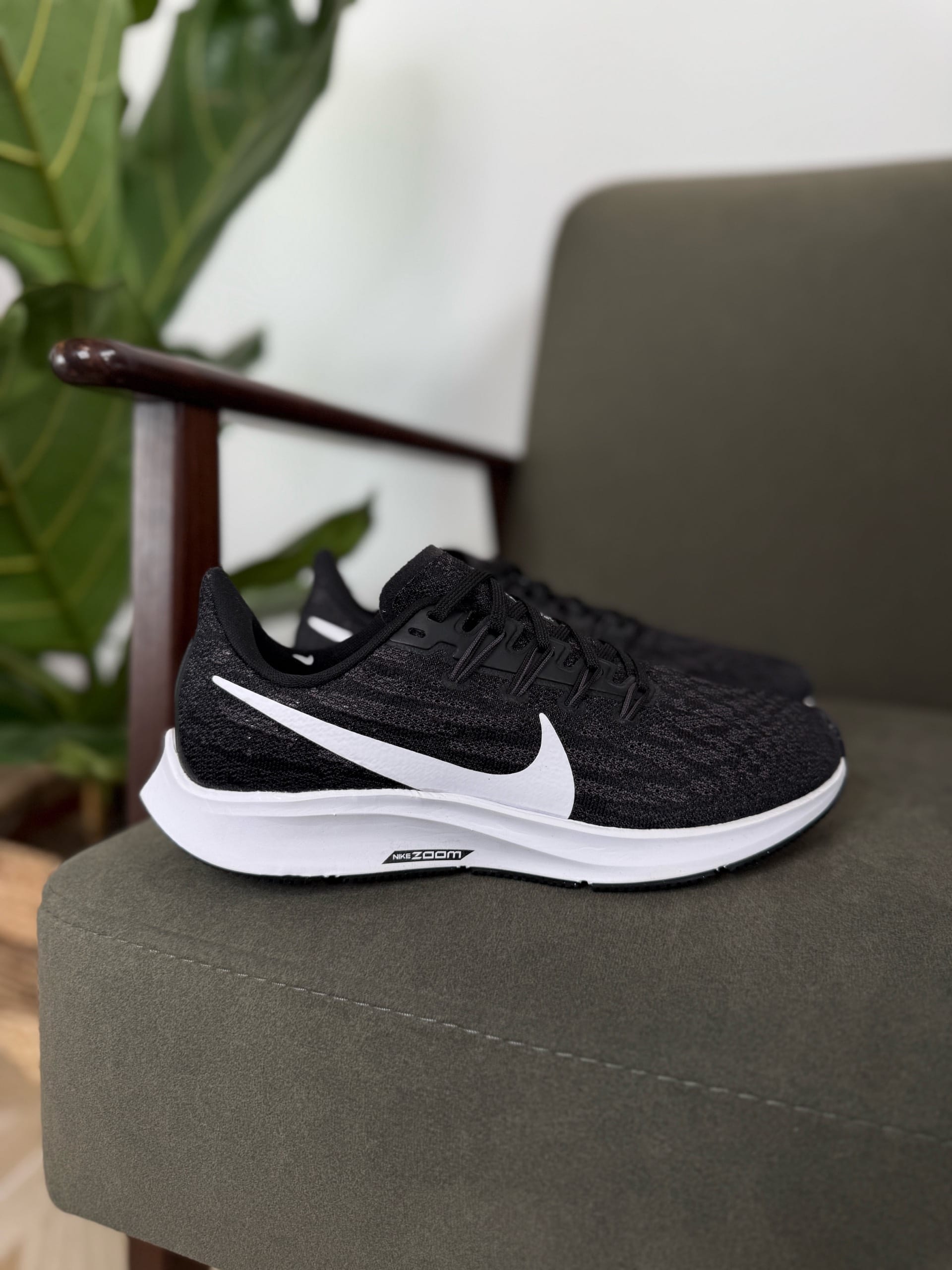 Це популярні бігові кросівки, відомі своєю універсальністю та комфортом. Вони мають легкий сітчастий верх для повітропроникності та амортизацію Zoom Air для чуйного відчуття. Підошва білого кольору з написом "NIKE ZOOM" на бічній частині.
