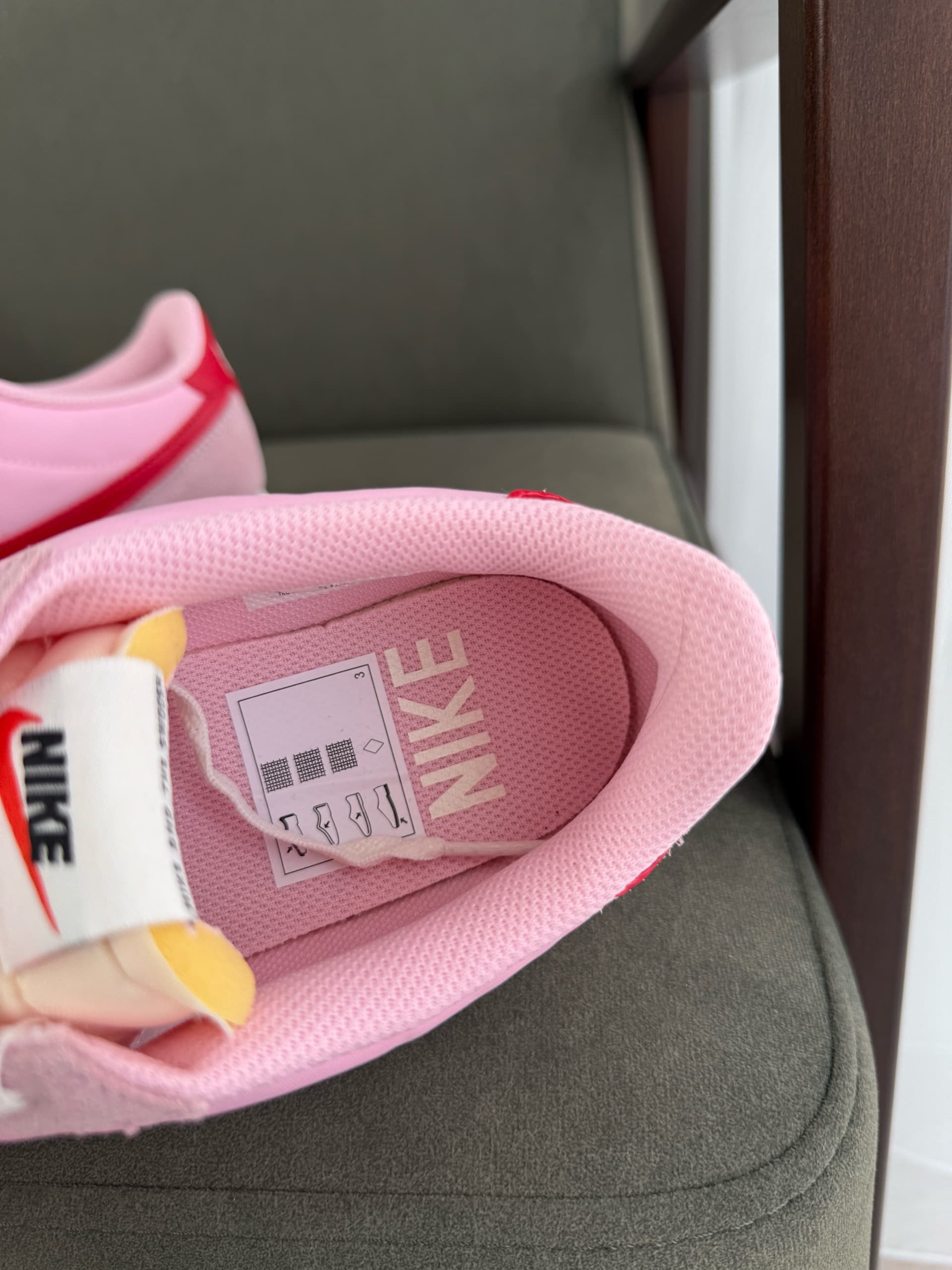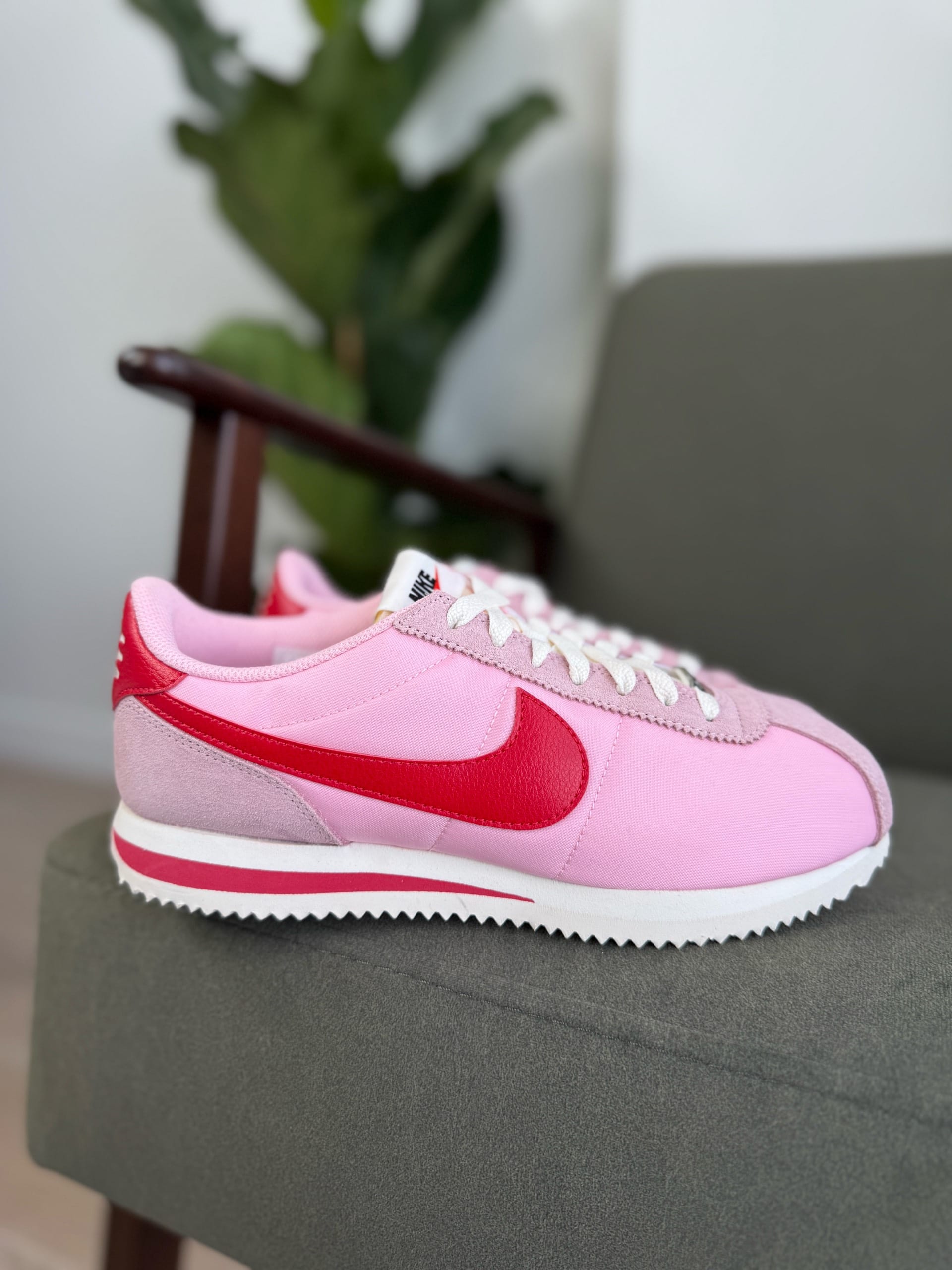 Це легендарні кросівки, вперше представлені в 1972 році, які стали символом комфорту, стилю та функціональності. Вони були розроблені для бігунів, але швидко здобули популярність як взуття для щоденного носіння. Конкретна модель на фото виконана у рожевому кольорі з яскравими червоними акцентами на логотипі-галочці та елементах підошви.
