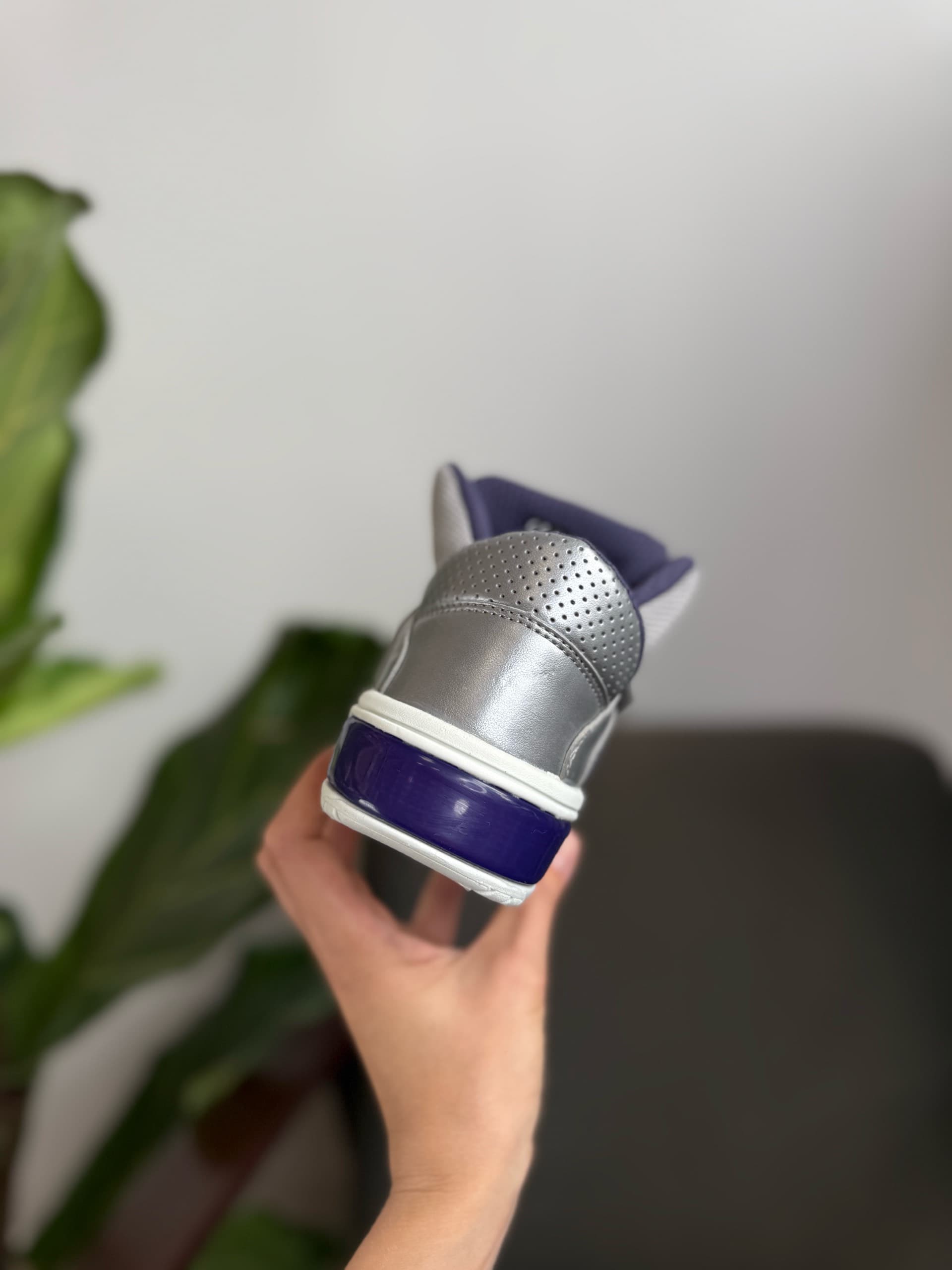 Дизайн: Кросівки мають сучасний спортивний дизайн з глянцевим сріблястим синтетичним верхом та синіми акцентами, включаючи смужки збоку та вставку на підошві.