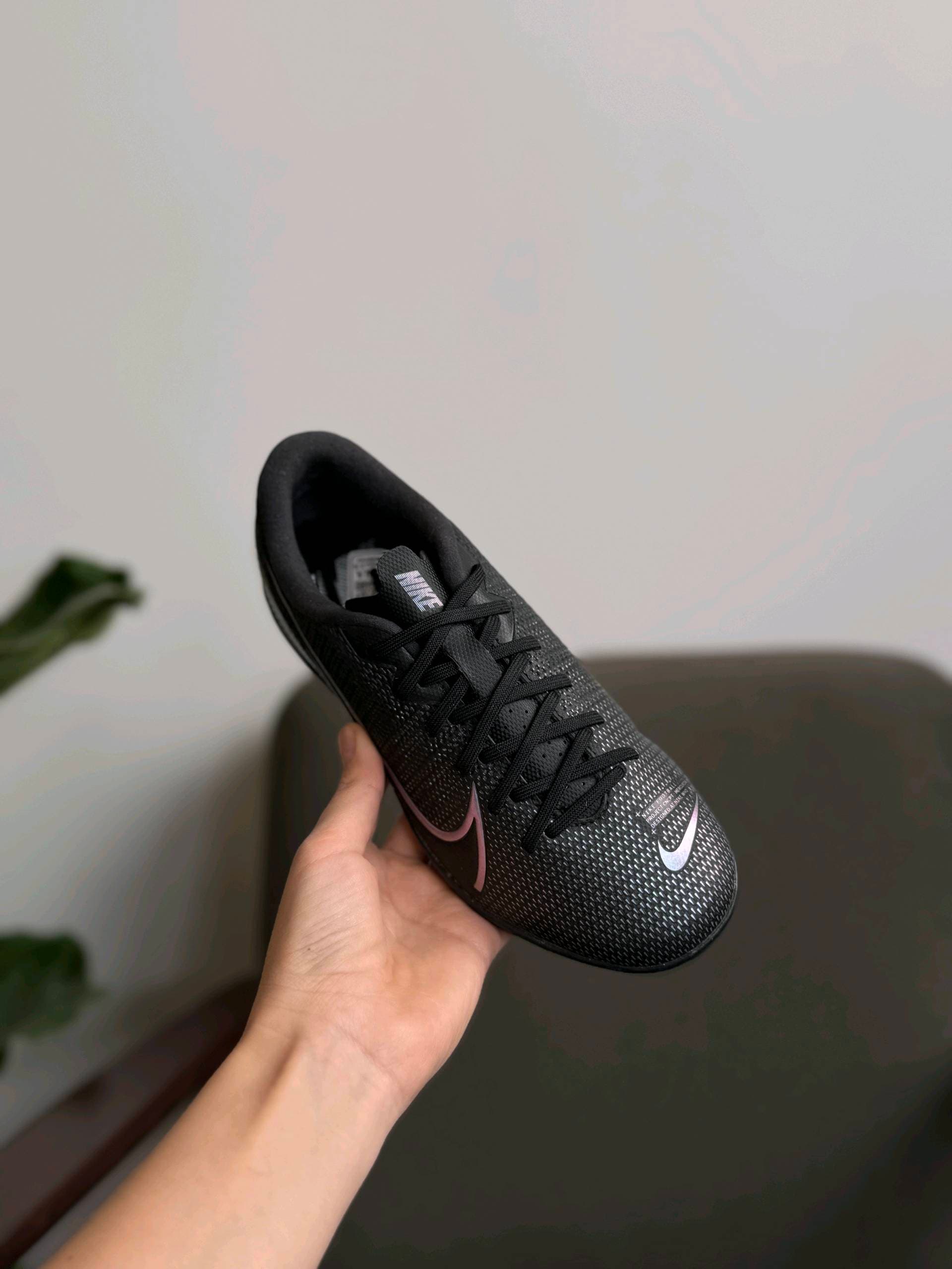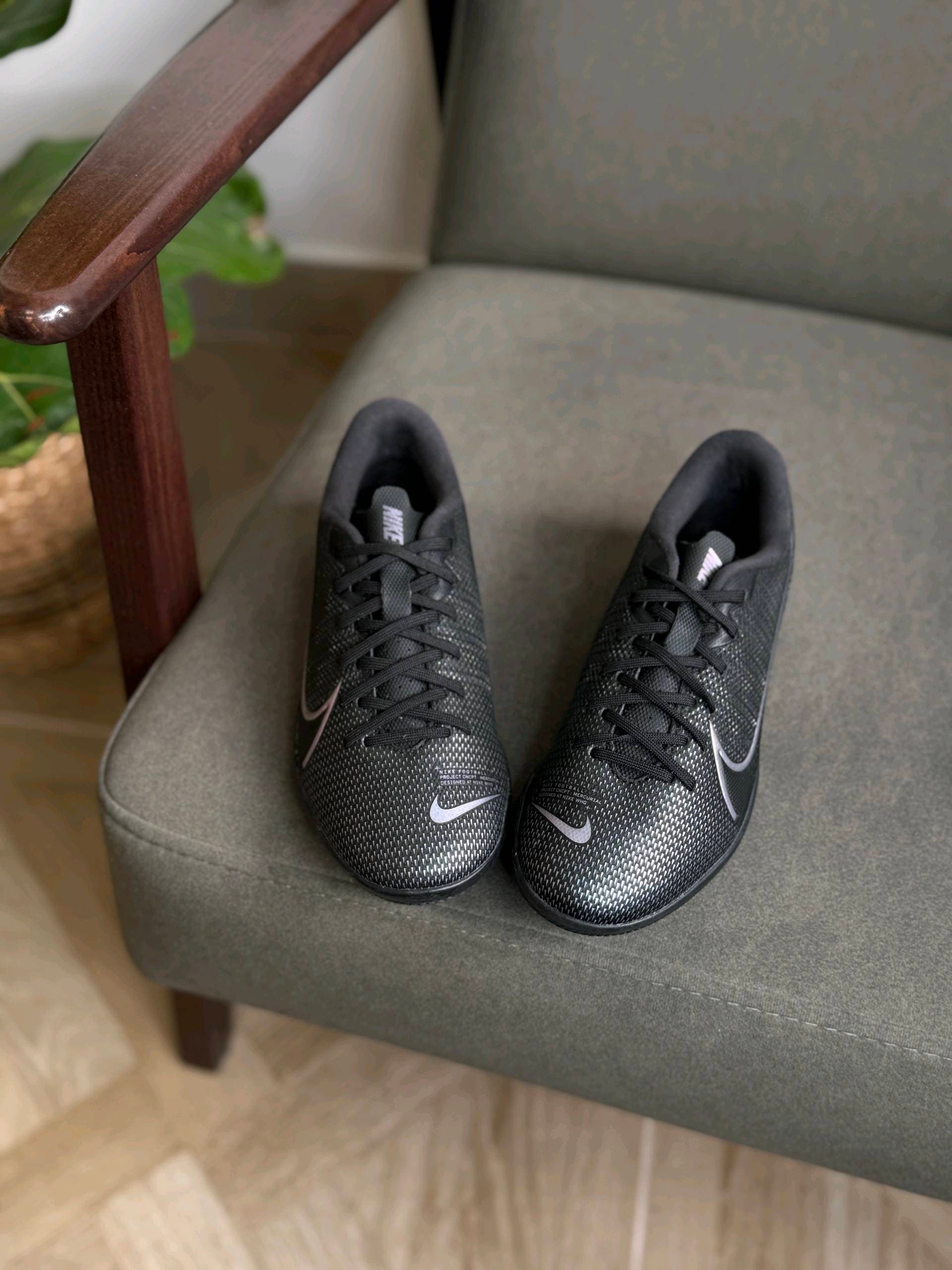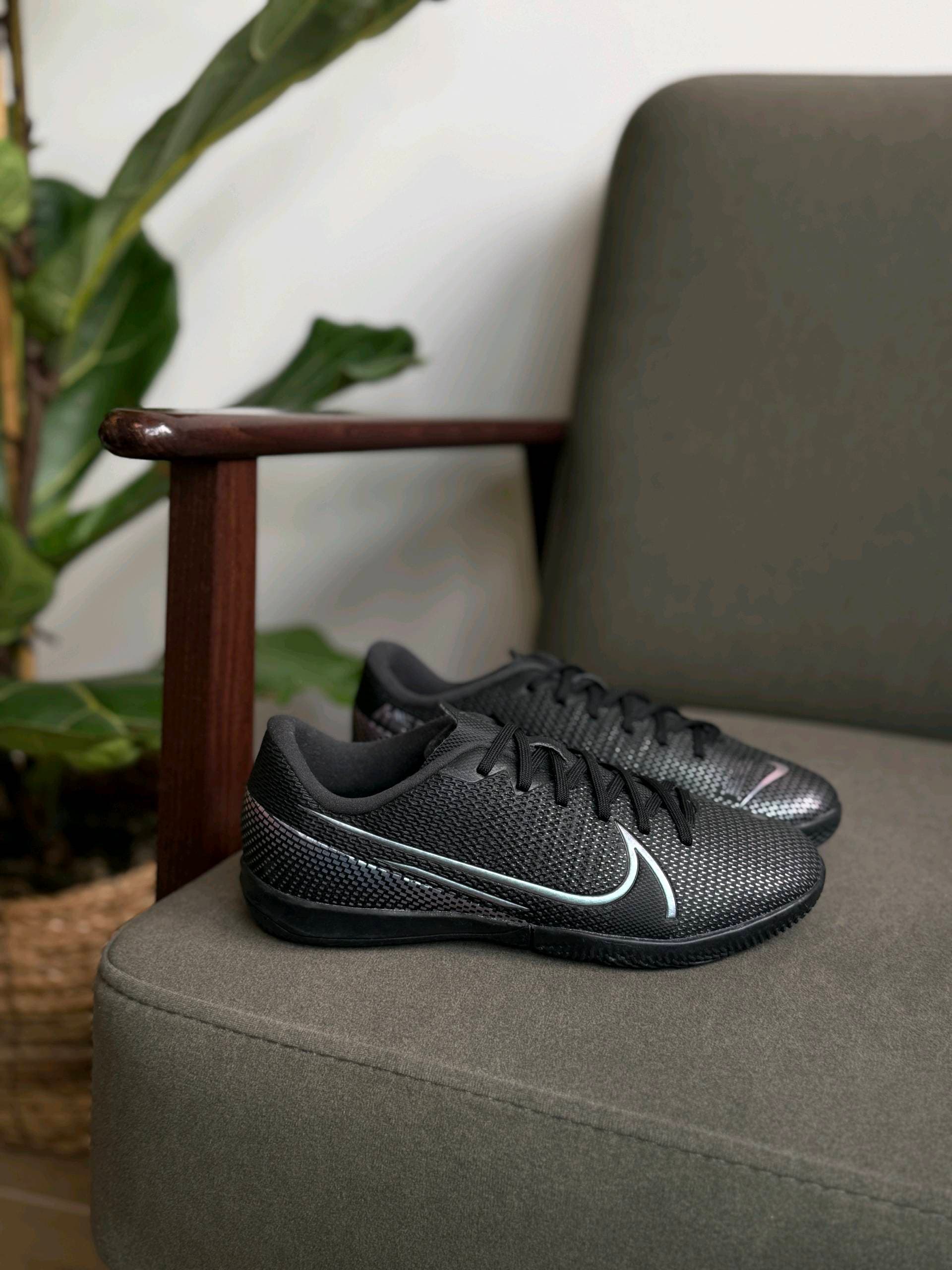 Чорні футзальні кросівки Nike з низьким профілем. Вони мають текстурований верх і переливчастий логотип Swoosh збоку. Імовірно, це модель із лінійки Nike Mercurial Vapor