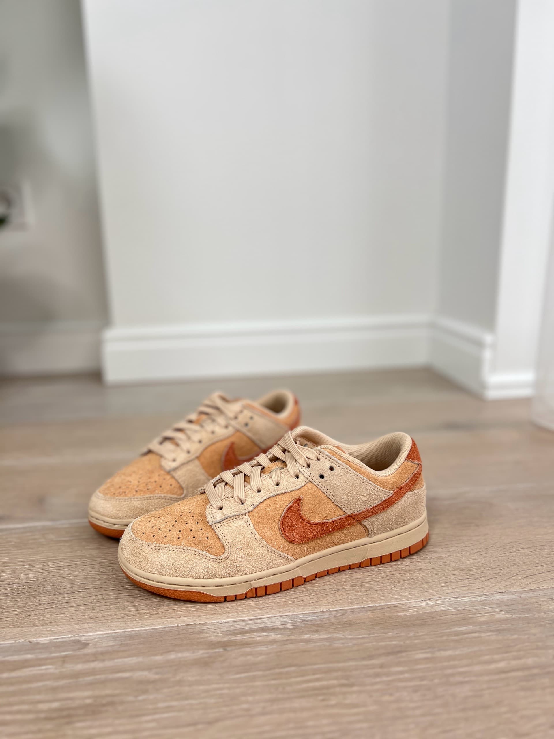 Це жіноча модель кросівок Nike Dunk Low. Вони виконані з високоякісної замші з текстурою, що нагадує шерсть або фліс. Колірна гамма поєднує відтінки бежевого, кремового та насиченого помаранчевого ("Burnt Sunrise").