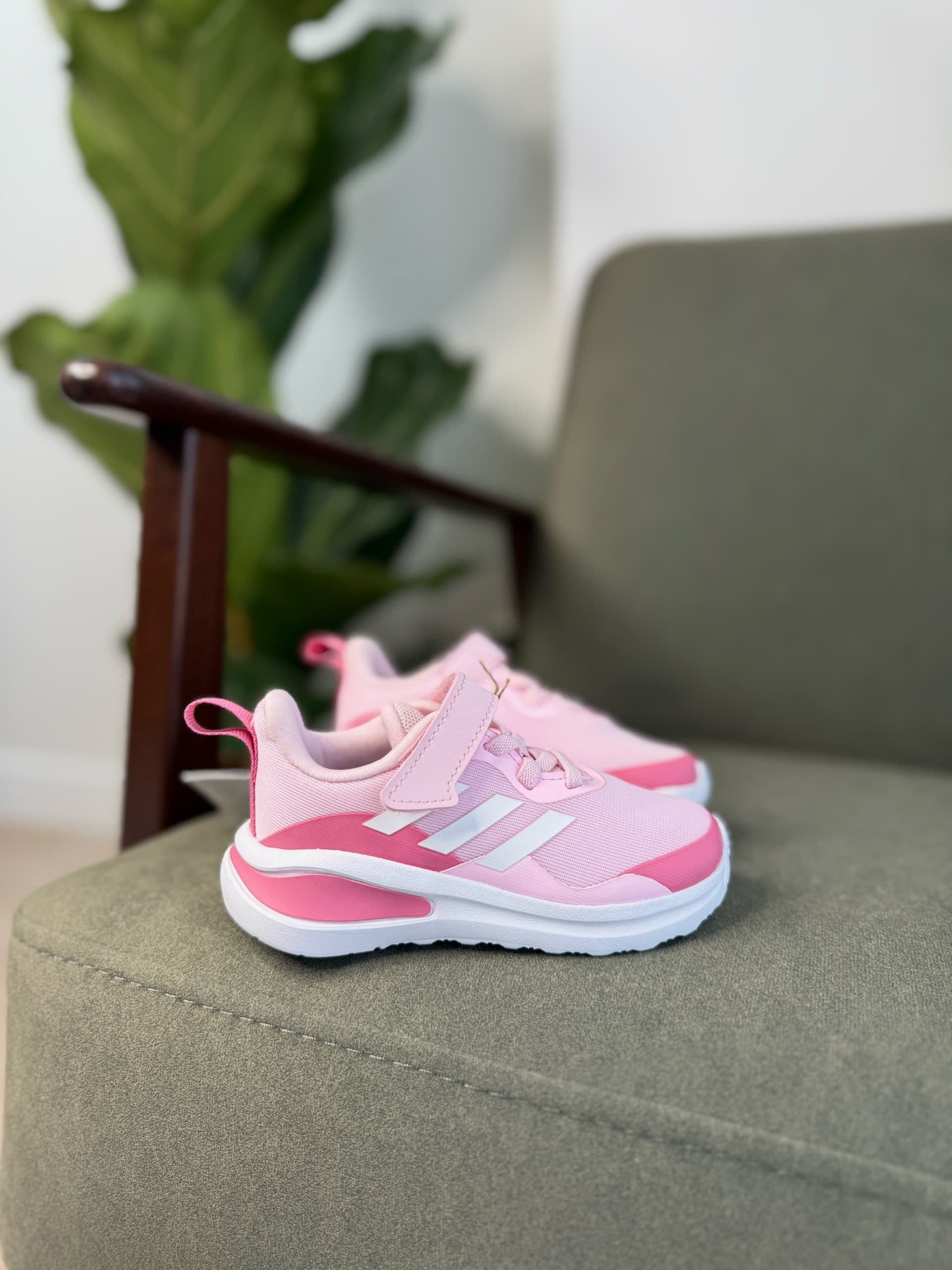 Рожеві дитячі кросівки з текстильним верхом, білими смужками Adidas збоку, білою проміжною підошвою та застібкою-липучкою поверх шнурків. Вони призначені для комфорту та підтримки під час активних ігор.