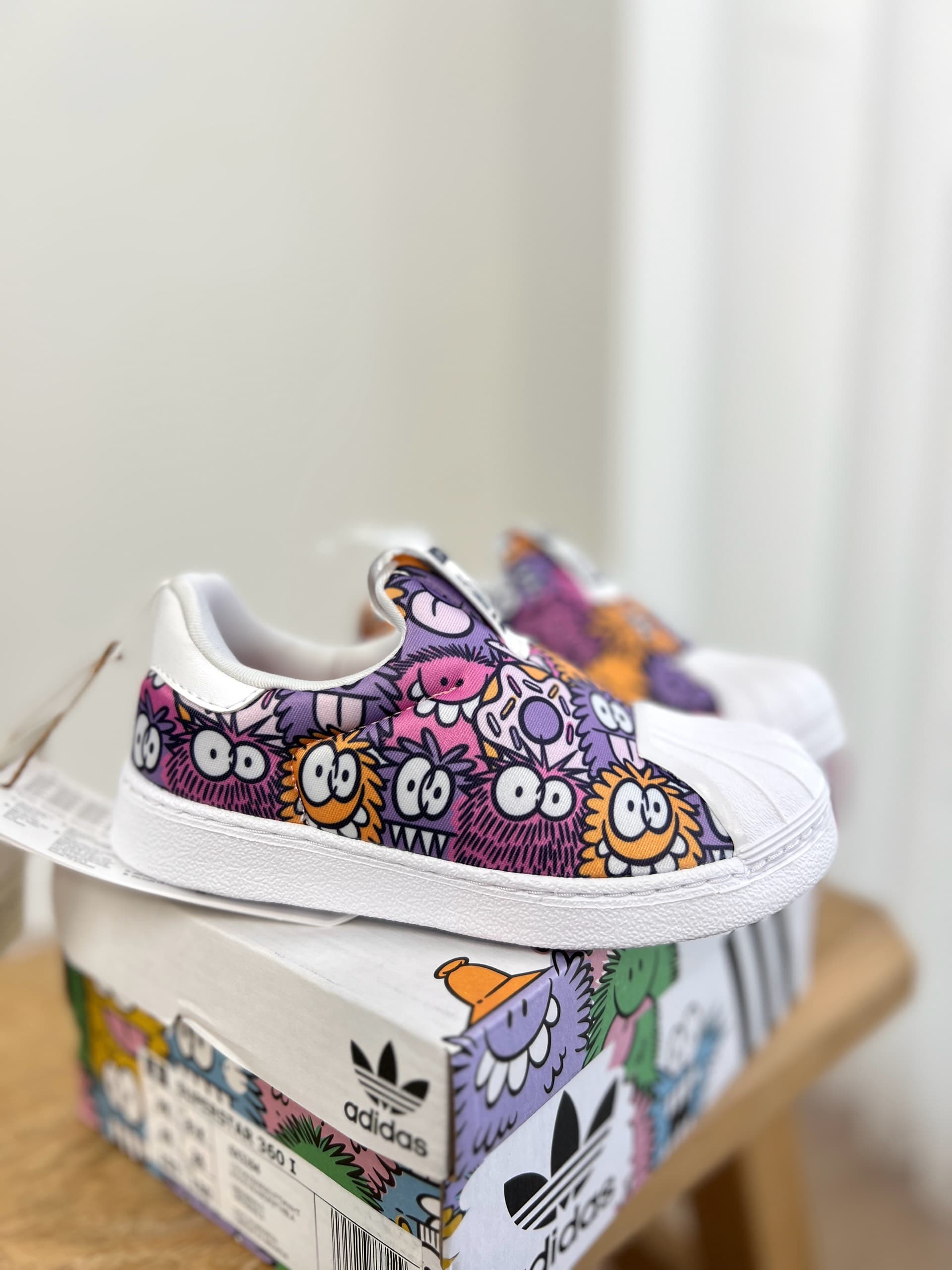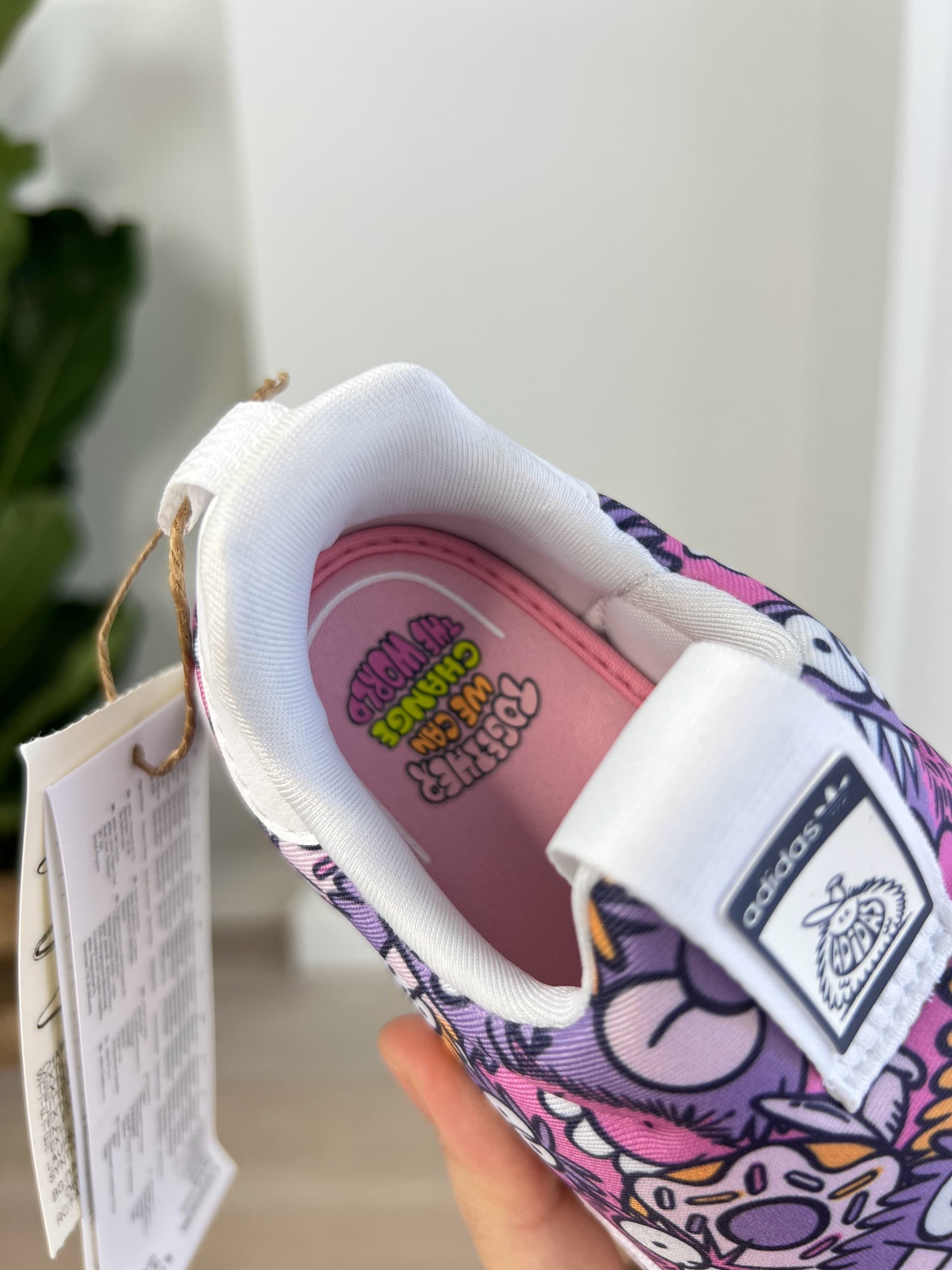 Ці кросівки є результатом співпраці Adidas з бруклінським художником Кевіном Лайонсом (Kevin Lyons). Вони мають яскравий фіолетово-рожевий дизайн з принтами монстрів, що є фірмовим стилем художника.