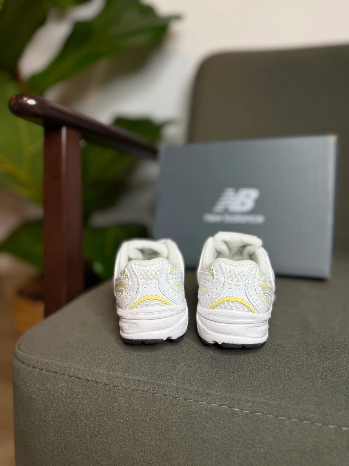 Дизайн: Взуття має сітчастий верх для повітропроникності з синтетичними накладками білого кольору та яскравими жовтими акцентами, включаючи логотип "N" збоку.