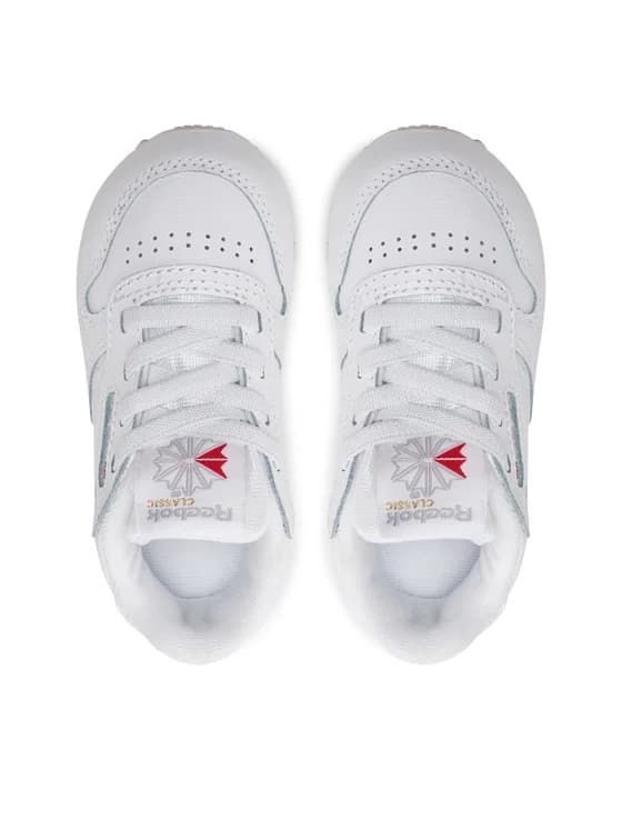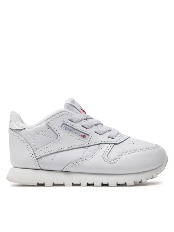 Це класична модель спортивного взуття Reebok білого кольору, виготовлена зі шкіри, з традиційним дизайном і шнурівкою.