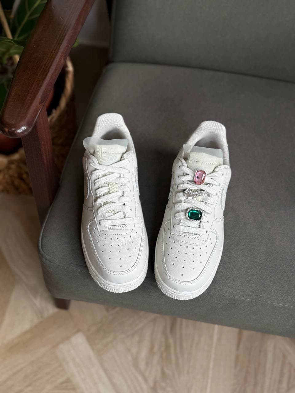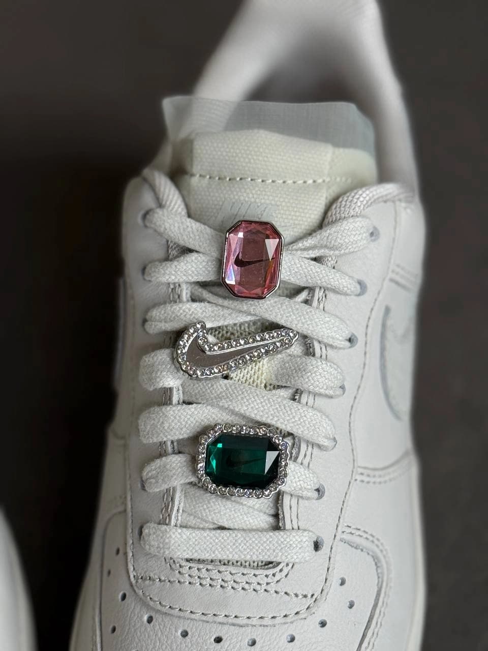 - Ювелірні акценти: Головна особливість цієї моделі — змінні металеві дюбре (прикраси на шнурках), що нагадують дорогоцінне каміння. Вони додають образу вишуканості та сяйва.