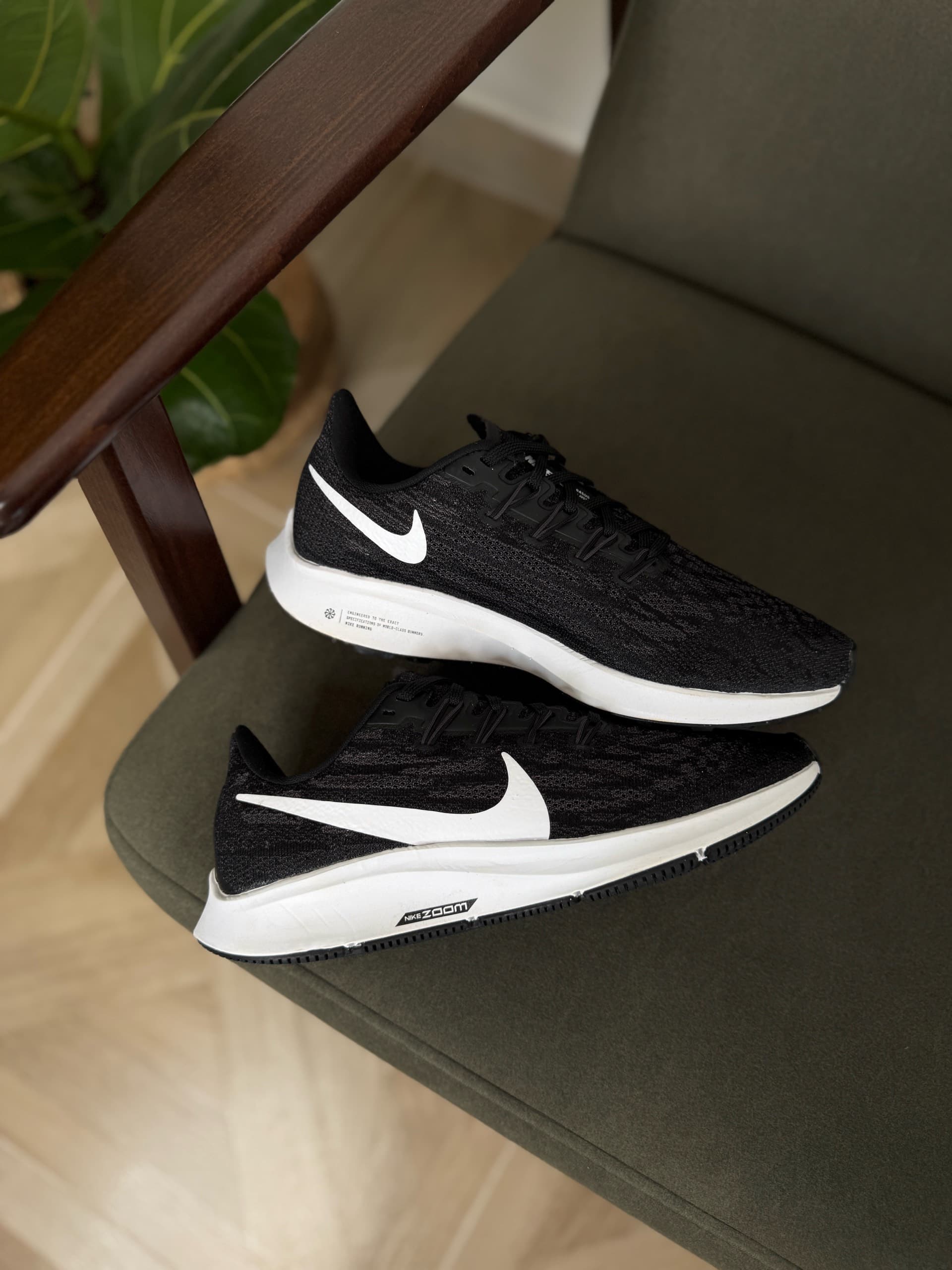 Це популярні бігові кросівки, відомі своєю універсальністю та комфортом. Вони мають легкий сітчастий верх для повітропроникності та амортизацію Zoom Air для чуйного відчуття. Підошва білого кольору з написом "NIKE ZOOM" на бічній частині.