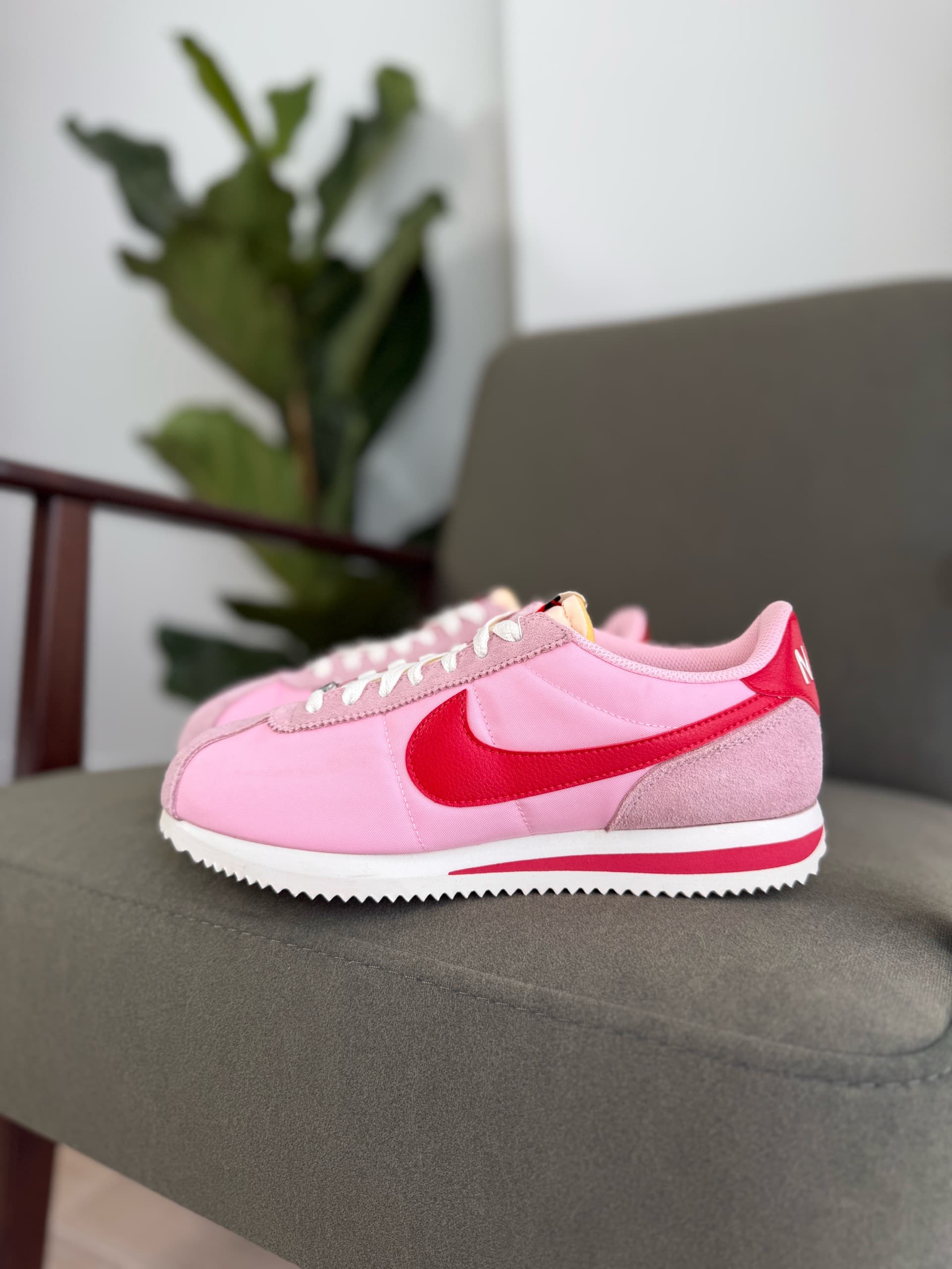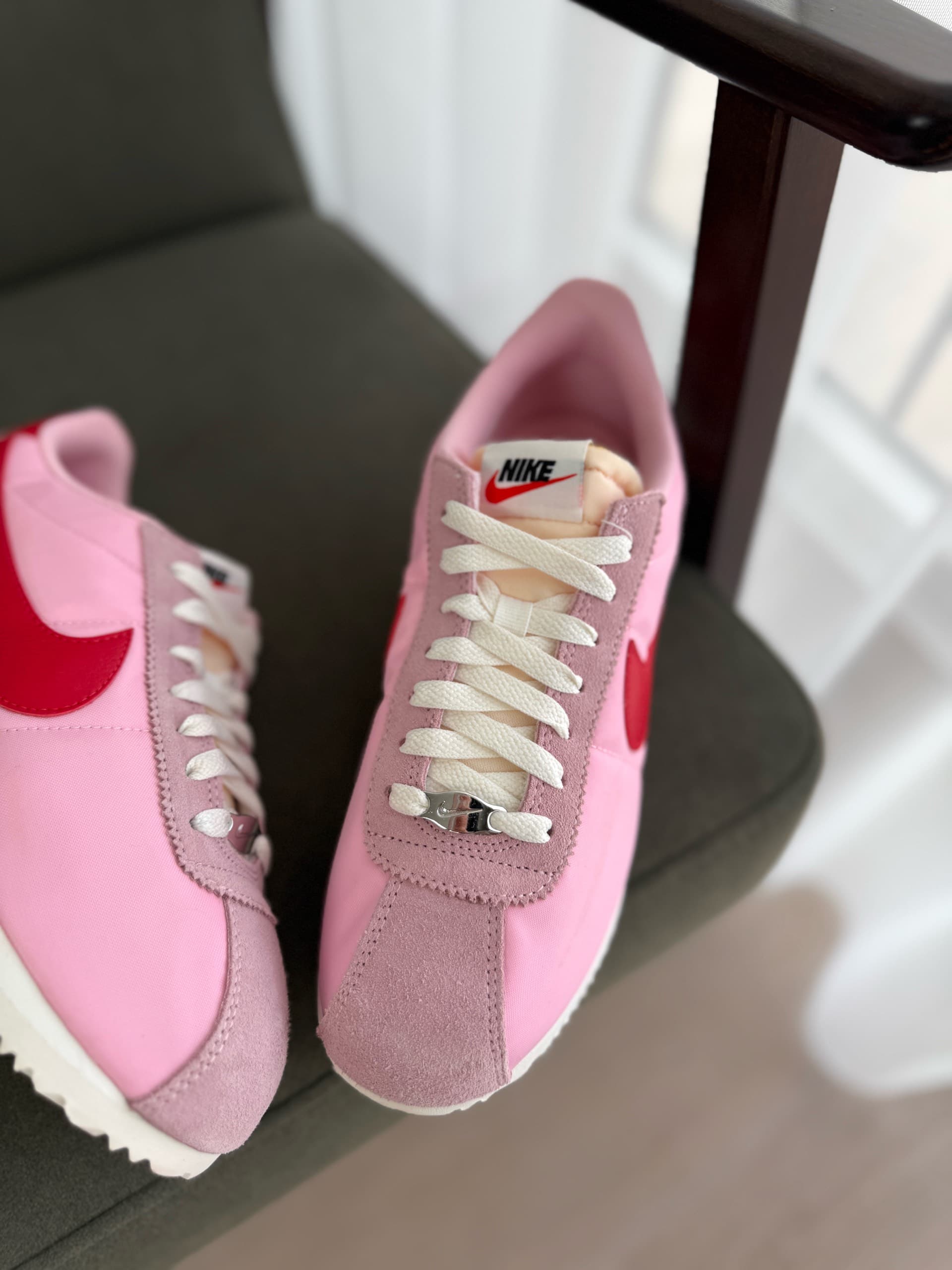 Це легендарні кросівки, вперше представлені в 1972 році, які стали символом комфорту, стилю та функціональності. Вони були розроблені для бігунів, але швидко здобули популярність як взуття для щоденного носіння. Конкретна модель на фото виконана у рожевому кольорі з яскравими червоними акцентами на логотипі-галочці та елементах підошви.