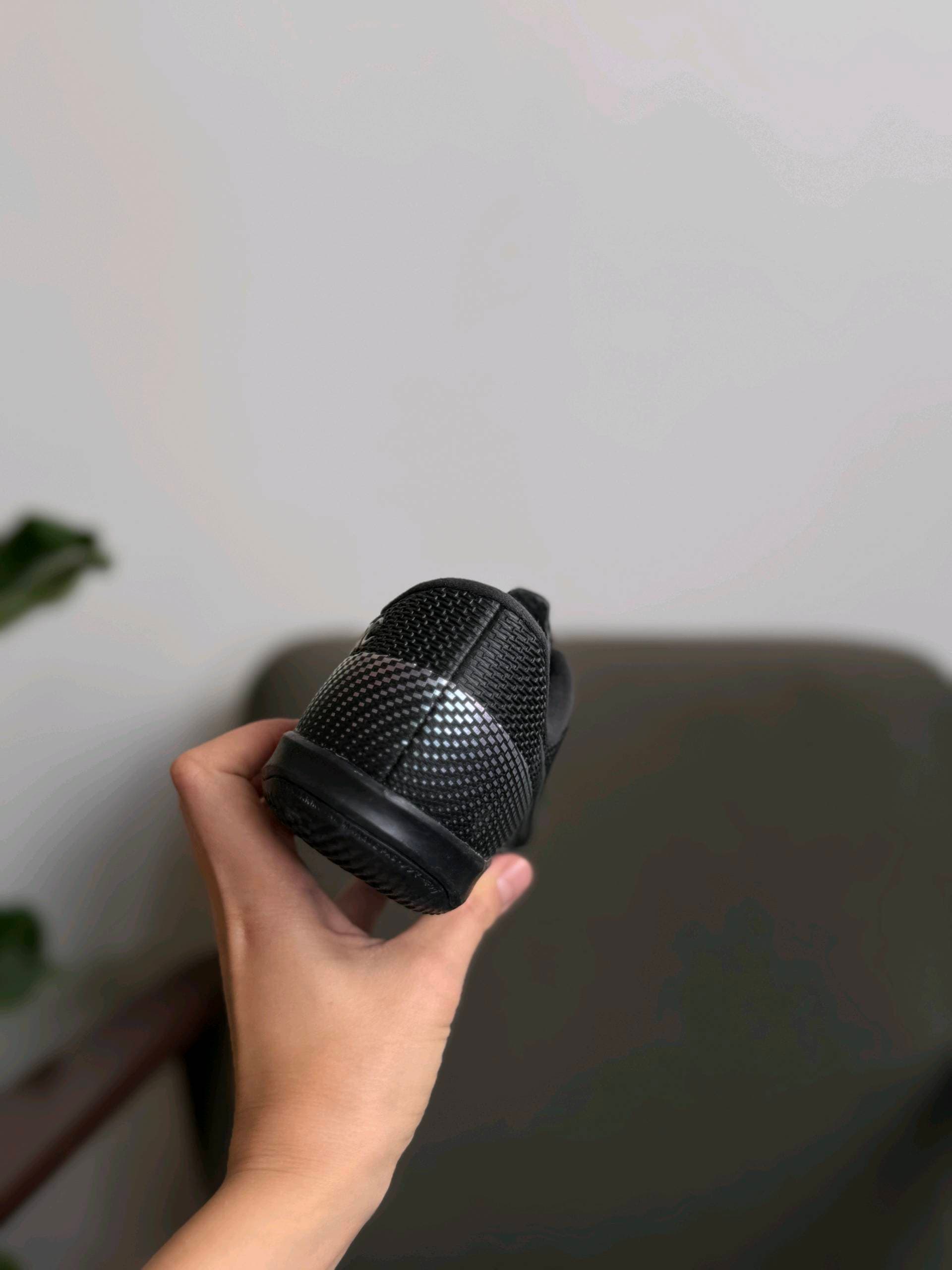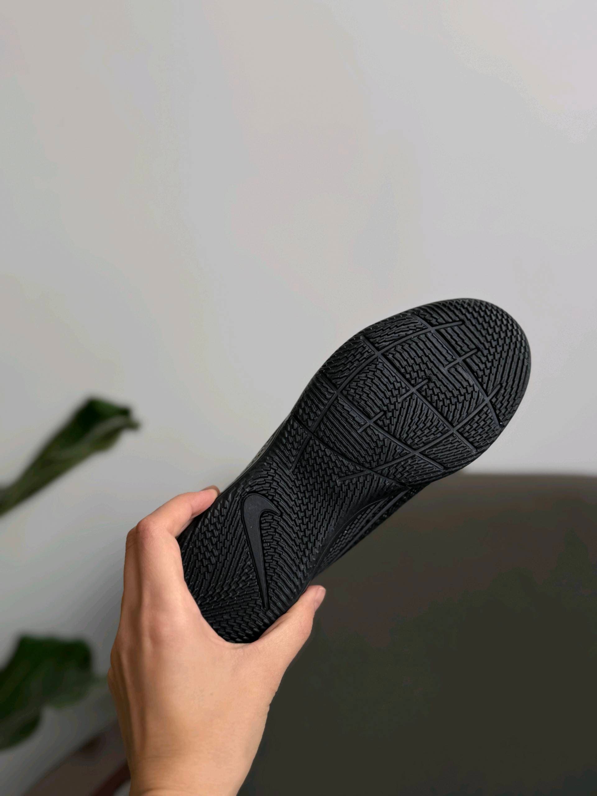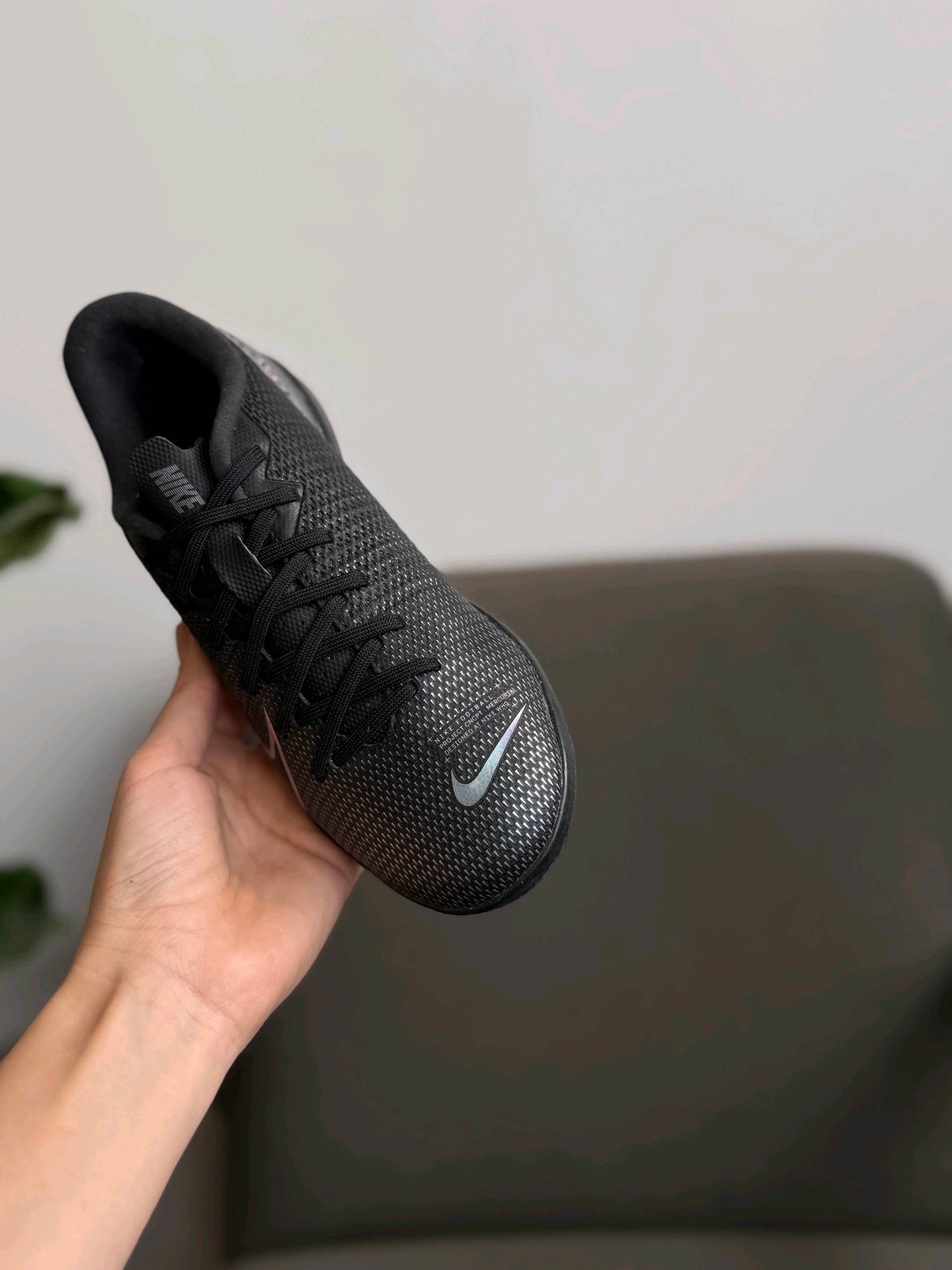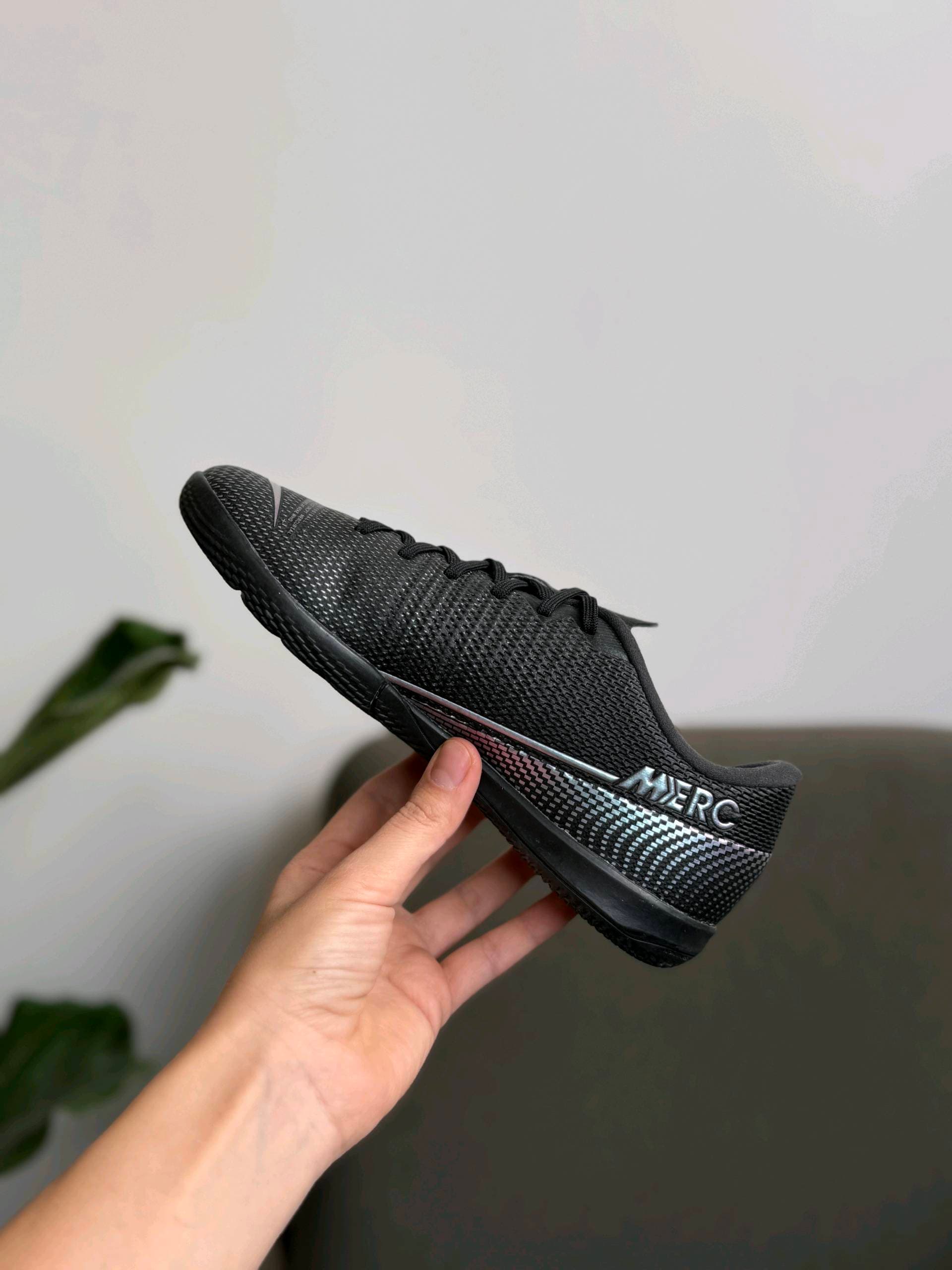 Чорні футзальні кросівки Nike з низьким профілем. Вони мають текстурований верх і переливчастий логотип Swoosh збоку. Імовірно, це модель із лінійки Nike Mercurial Vapor